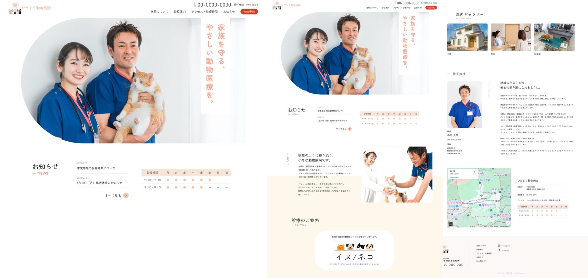 イヌ・ネコのイラストをメインに配置することで、「この病院はどんな動物を診てくれるのか」が一瞬で伝わるように設計。