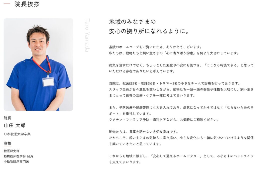 院長の写真を大きく、清潔感のあるポーズで掲載することで、初めて訪れる飼い主にも安心感を与えています。