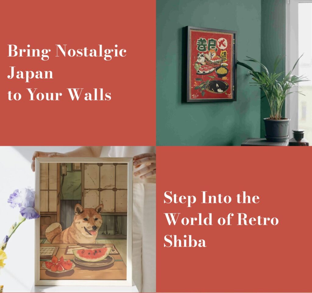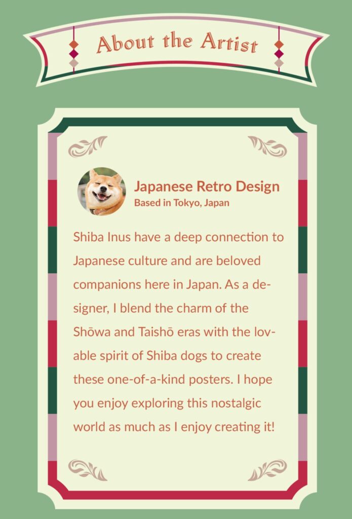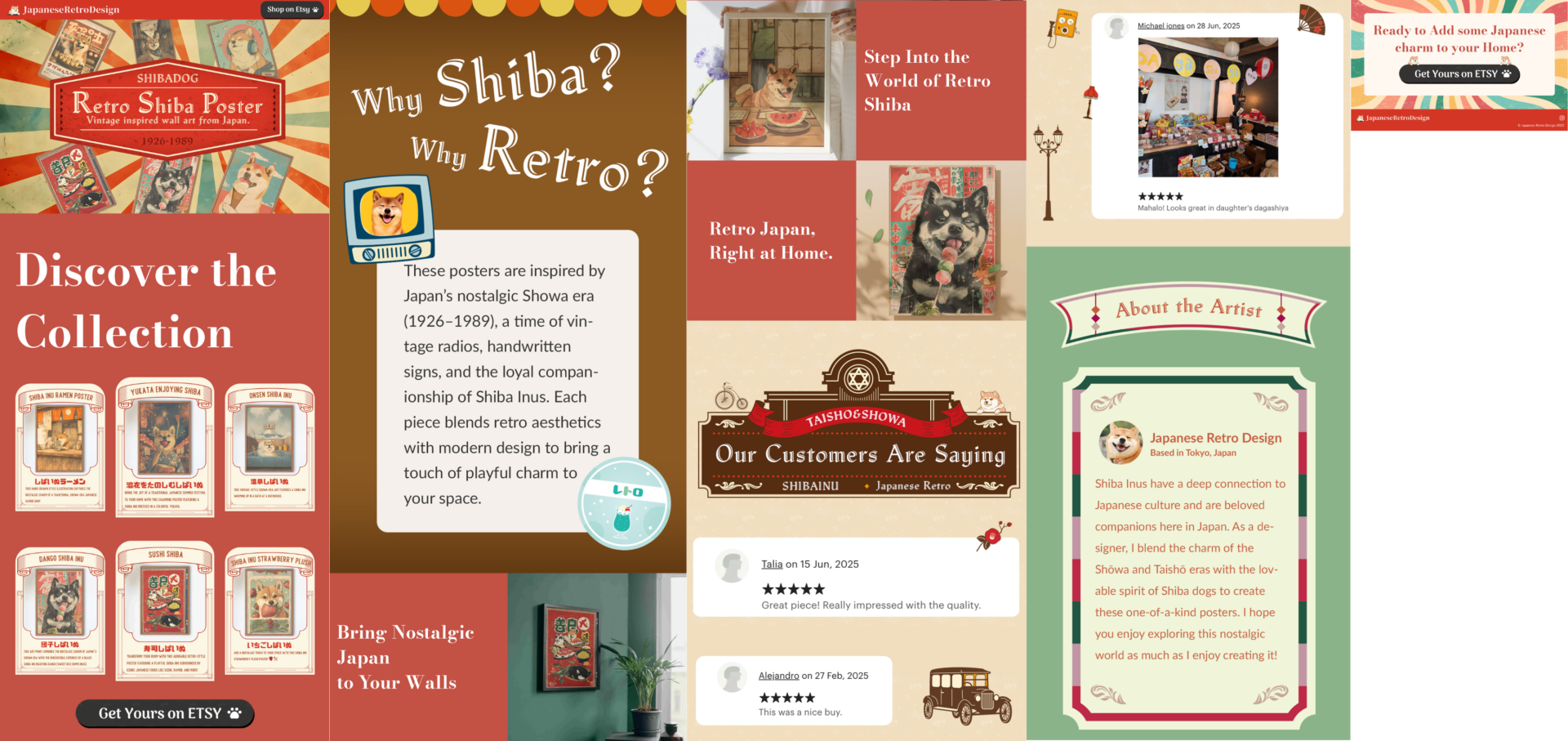 「Bring Nostalgic Japan to Your Walls」「Step Into the World of Retro Shiba」といったコピーで、“昭和レトロ×柴犬”のコンセプトをわかりやすく訴求。短くても感覚的に伝わる表現で、海外ユーザーにも響く設計です。