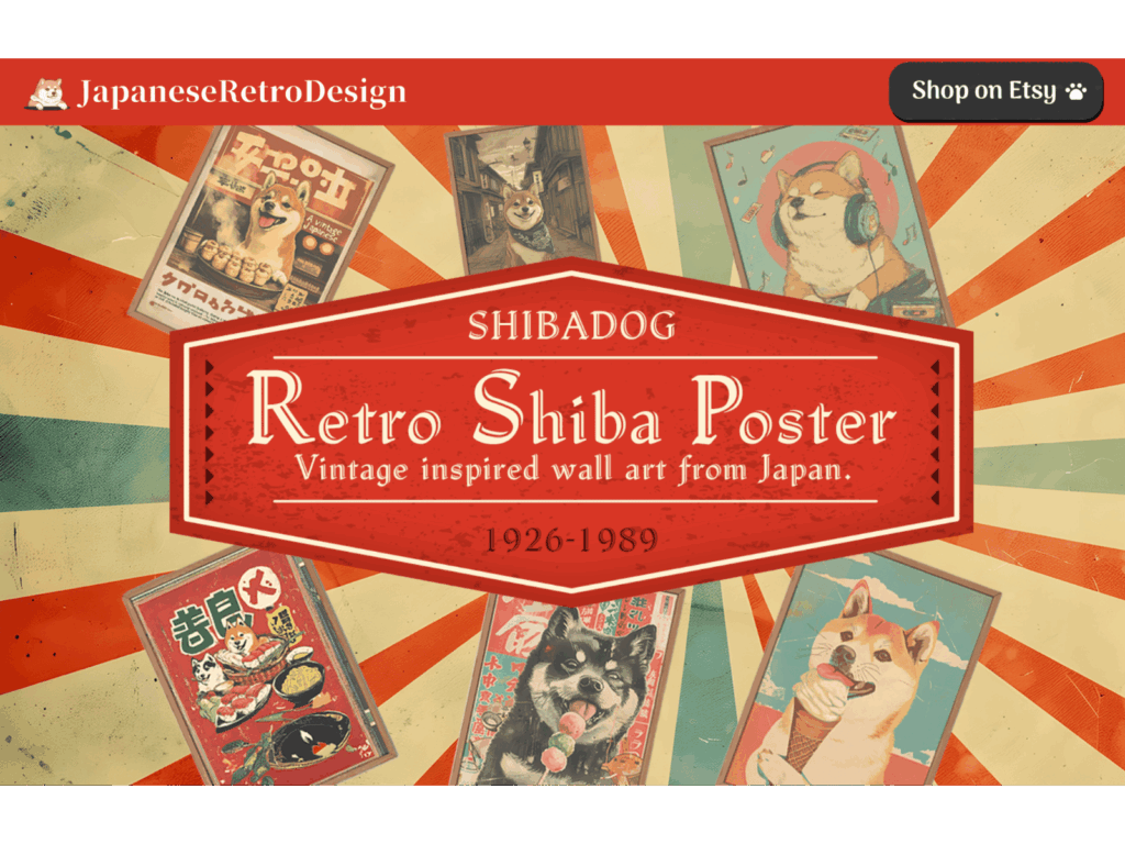 「Retro Shiba Poster – Vintage inspired wall art from Japan.」と短いコピーで商品の特徴を表現。英語と日本語を織り交ぜることで、日本らしさと国際感覚を両立し、海外ユーザーに刺さる設計になっています。