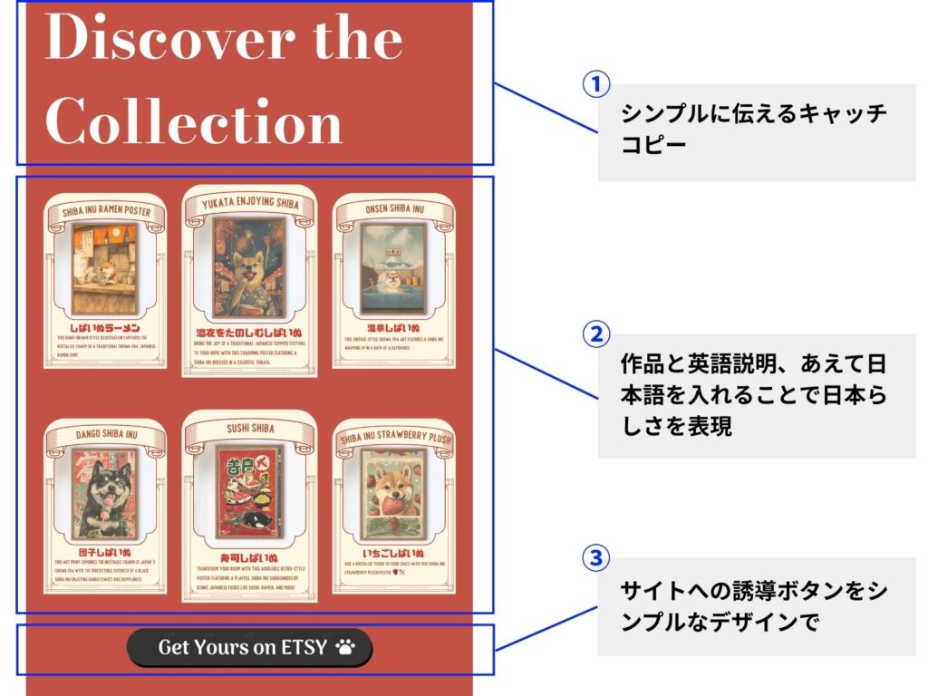 「Get Yours on ETSY」と行動を明確に示すボタンを設置。デザインをシンプルに保つことで、迷わず購入ページへ誘導できるようにしています。