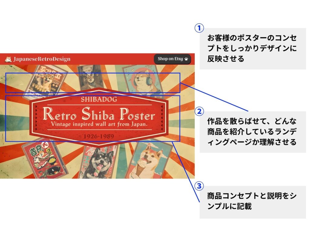複数のポスターを背景に配置することで、「このLPは柴犬×レトロポスターを紹介している」と直感的に理解させます。具体的な作品イメージを前面に出すことで、購買意欲を高めています。