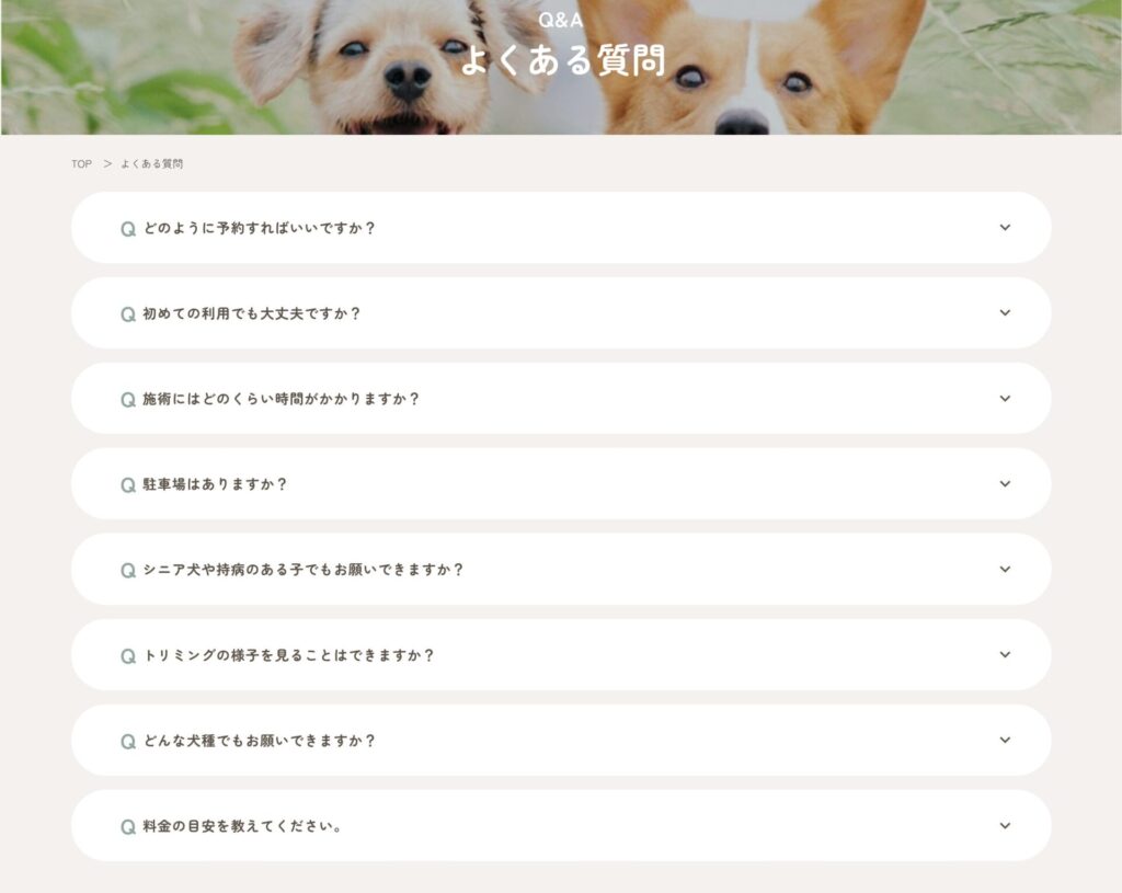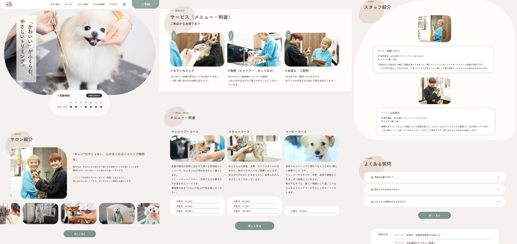 詳しいサービス内容とよくある質問の充実でお客様の疑問解決するドッグサロンのホームページを制作。