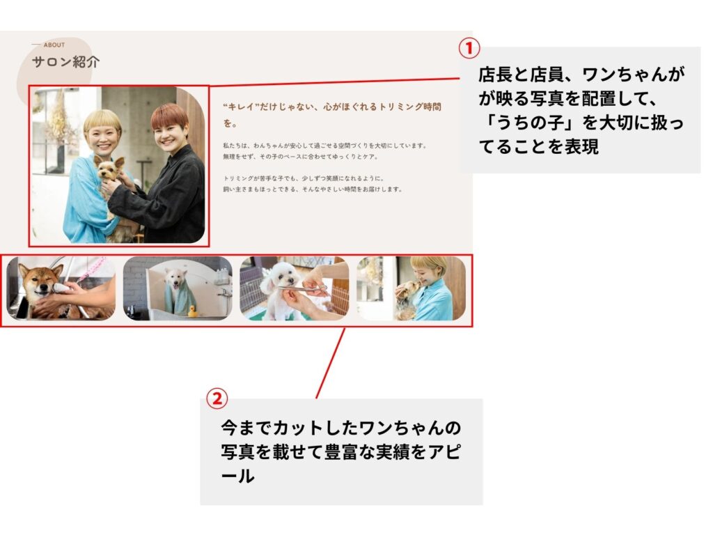 ① スタッフとワンちゃんの写真で“人柄”と“安心感”を伝える