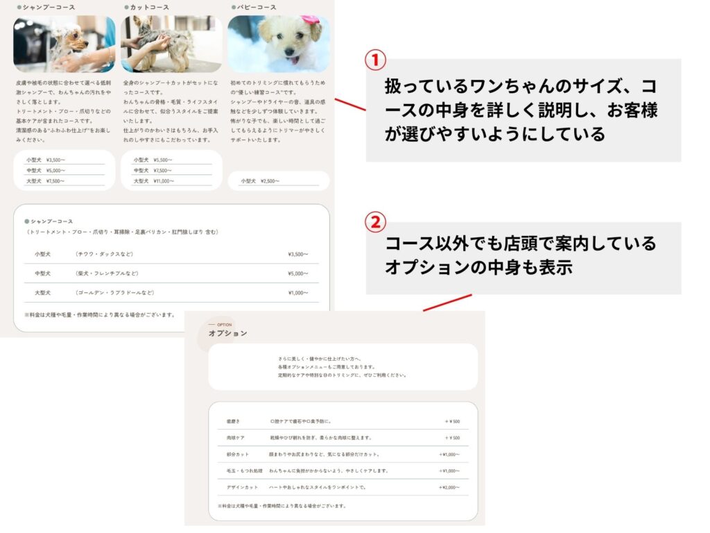 ワンちゃんのサイズやコース内容を細かく分けて説明することで、飼い主さんが自分の子に合うプランをすぐに判断できるようにしています。