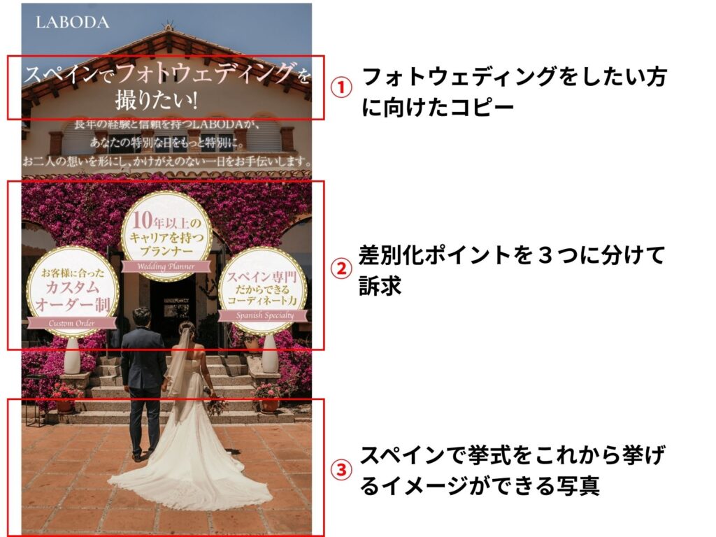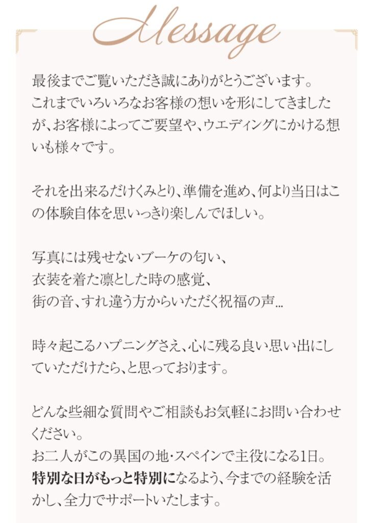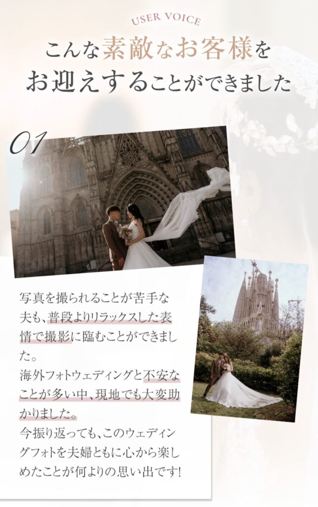 「スペインでフォトウェディングを撮りたい!」と直球で伝えることで、読み手が“自分ごと”と感じやすくなります。コピーを読んだ瞬間にターゲットを絞り込めるので、関心を持つ人はこの先を読み進めやすくなります。