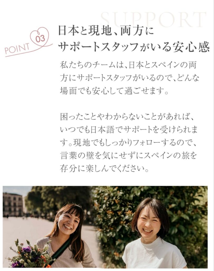 「10年以上のキャリア」「カスタムオーダー制」「スペイン専門のコーディネート力」と3つに分けて打ち出すことで、他社との違いを一目で理解できるようにしています。複数の強みを整理して並べることで、信頼性と説得力が増しています。