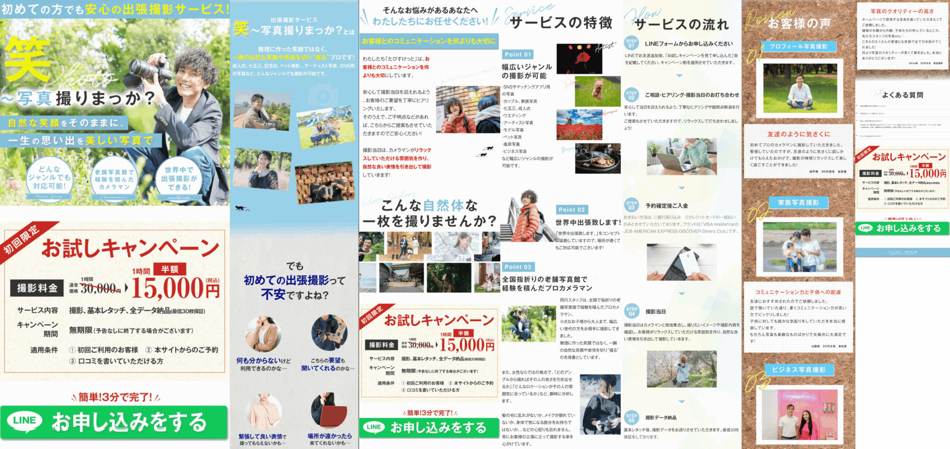 ・明朗会計やカメラマンの特徴をはじめのセクションに持ってきたりするなど内容をシンプルにして、初心者でもわかりやすく伝わる構成にしております。