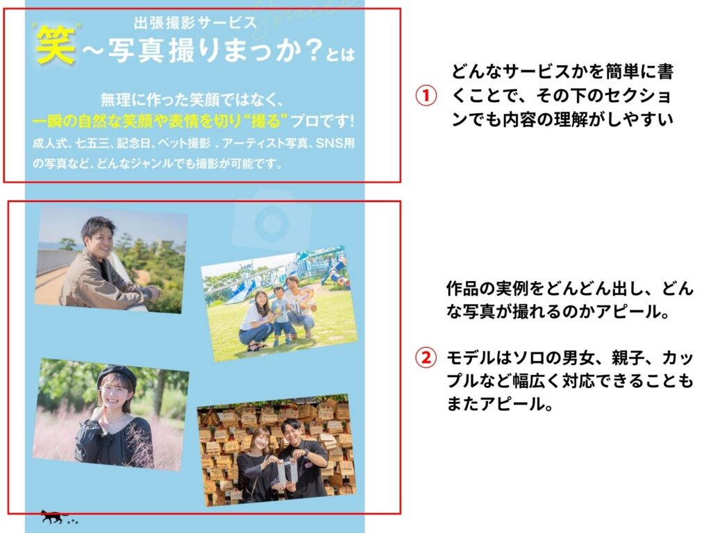 「初めての方でも安心の出張撮影サービス!」と明記することで、写真撮影サービスに不安を持つ初心者層にアプローチ。最初のコピーで心理的ハードルを下げ、読み進めてもらいやすくしています。