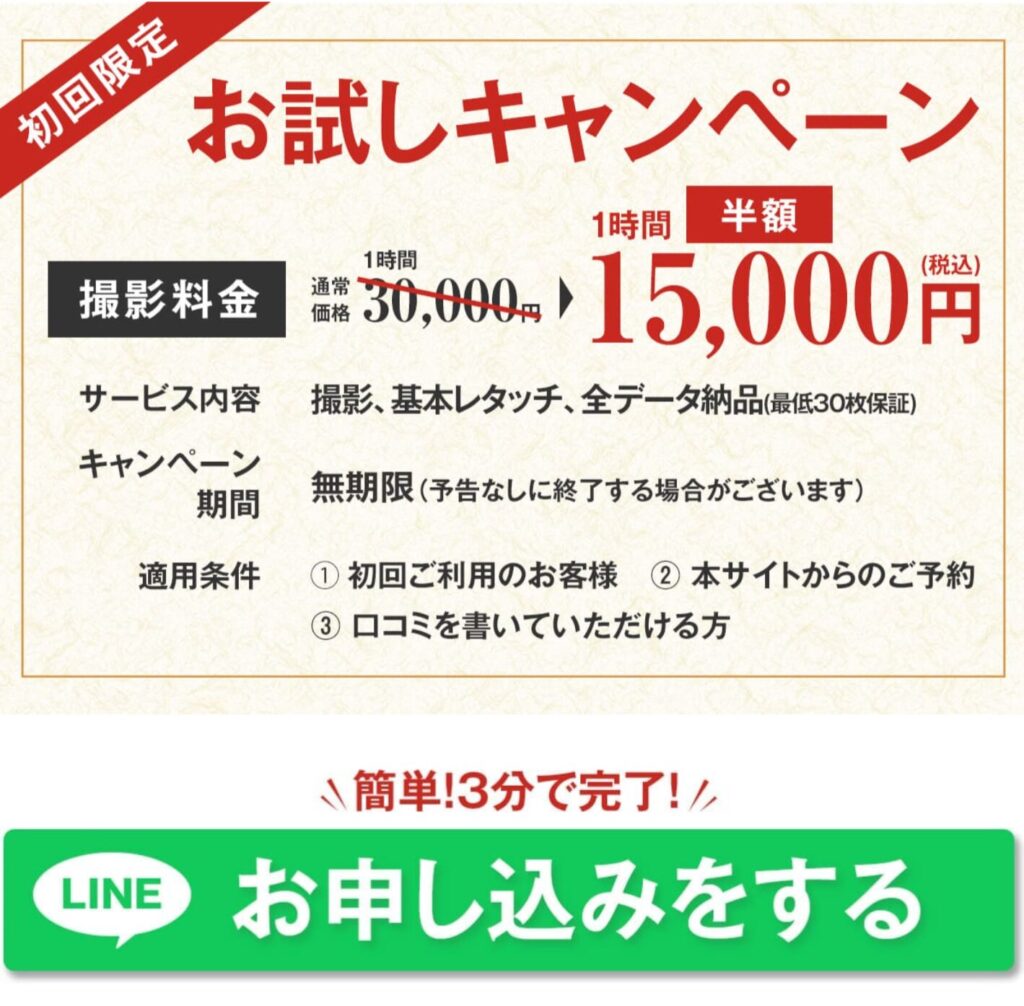 通常価格30,000円をあえて書いたうえで打ち消し、半額の15,000円を赤字で強調。比較対象を提示することで割引のインパクトを最大化させています。