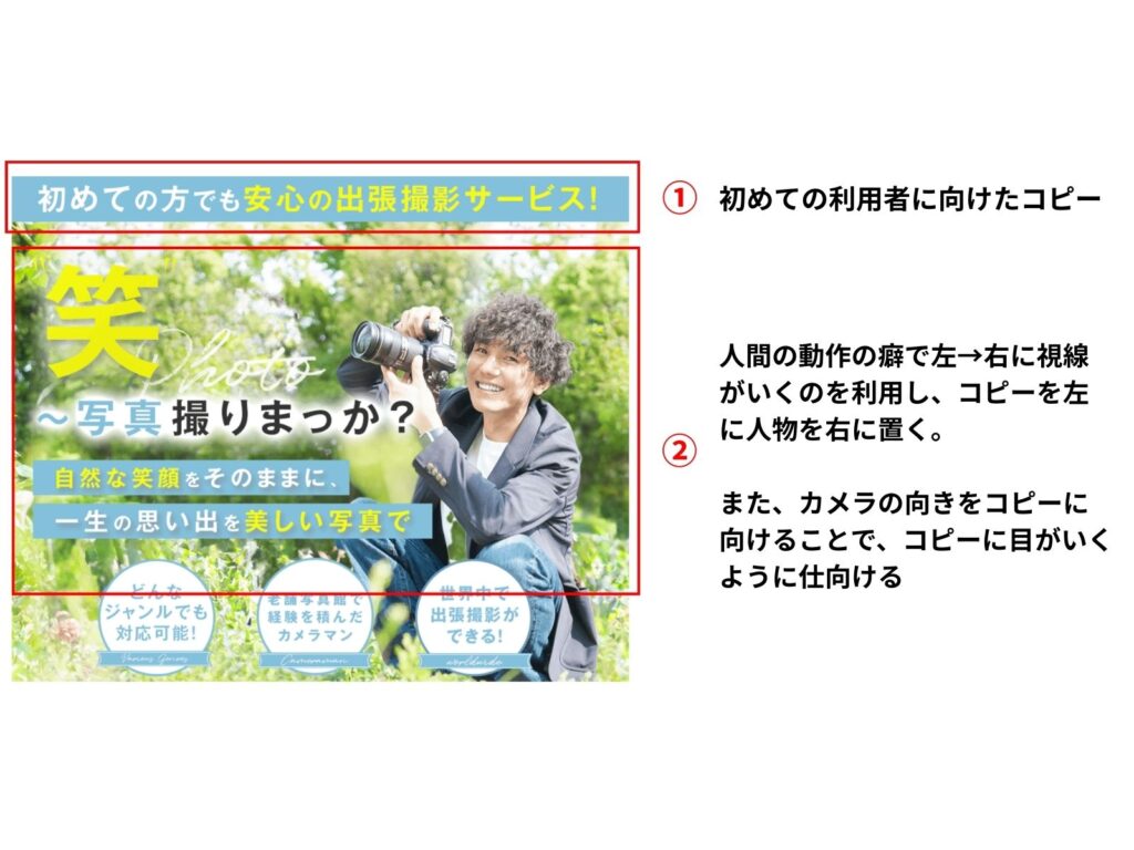 人間の自然な視線の流れ(左から右へ)を利用して、左側にコピー、右側にカメラマンを配置。さらにカメラの向きをコピー側へ向けることで、視線が自然と文字へ流れるように設計しています。