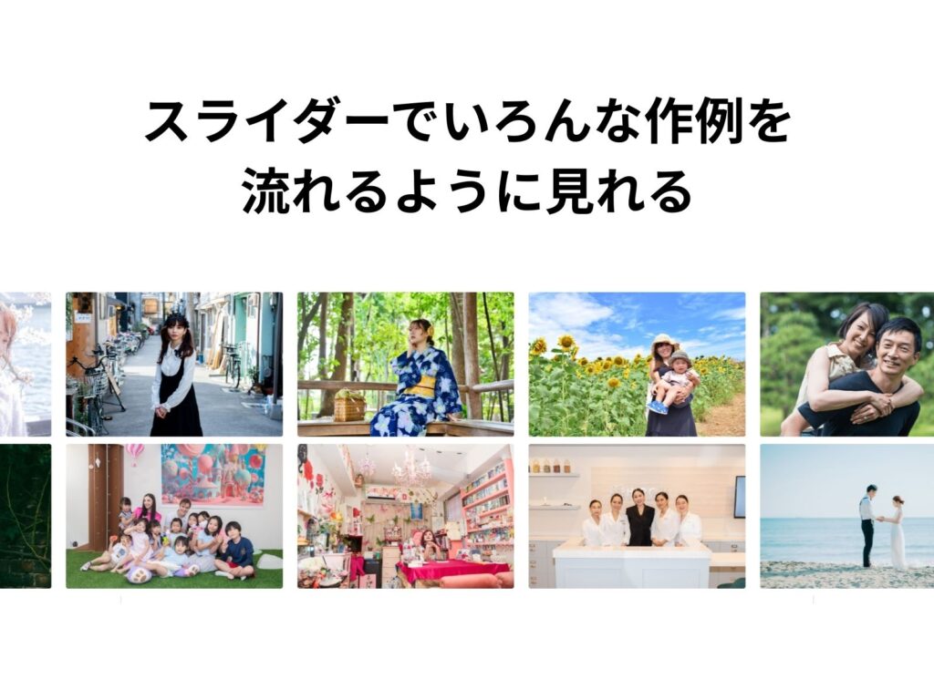 さまざまな撮影事例をスライダー形式で流れるように見せることで、サービスの幅広さを直感的に伝えています。静止画像を並べるよりも動きがあることで、ユーザーは“まだ他の事例もあるのかな?”と自然に視線を留め、滞在時間が伸びやすくなります。