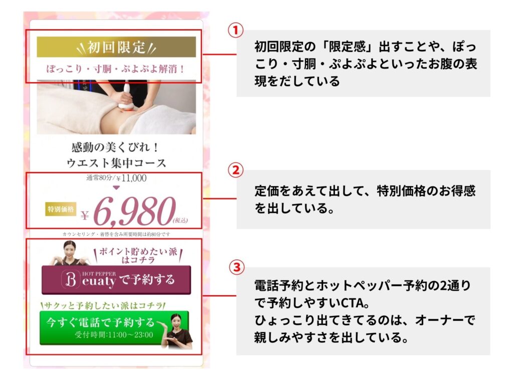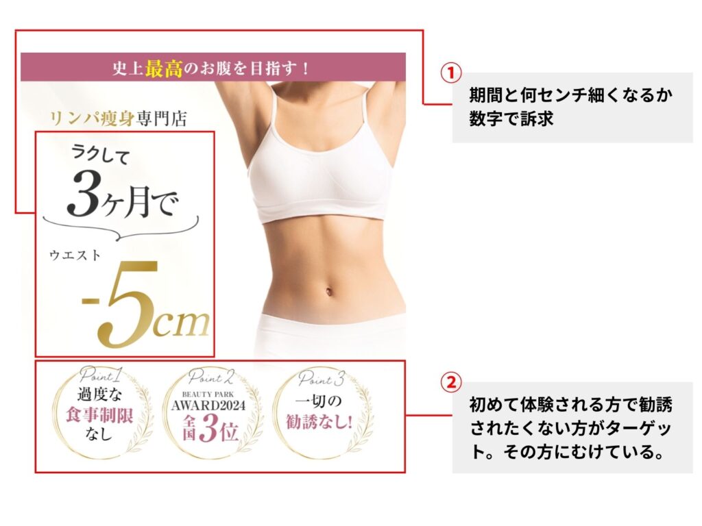 冒頭に「初回限定」と明記し、さらに「ぽっこり・寸胴・ぷよぷよ」といったリアルな悩み表現を添えることで、ユーザーは「自分のことだ」と感じやすくなります。こうすることで「早く申し込まなきゃ」という意識が生まれ、視線を自然に引きつけることができます。