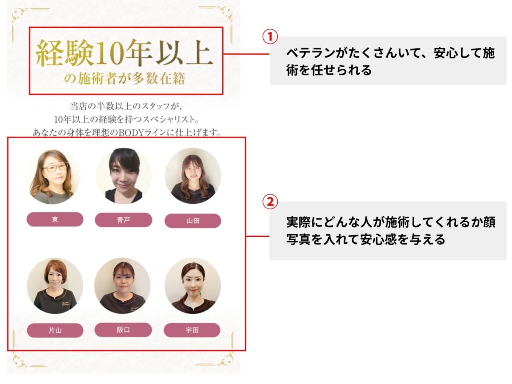 「経験10年以上の施術者が多数在籍」と大きく打ち出すことで、初めての方でも「ここなら安心して任せられる」と思えるようになります。専門性と実績を伝えることで、不安を解消します。