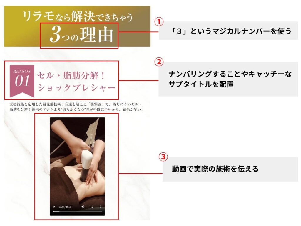 冒頭に「3つの理由」と提示することで、「すぐに理解できそう」「全部見てみたい」という気持ちを起こさせています。数字を使うことで情報量が整理され、納得感が高まります。