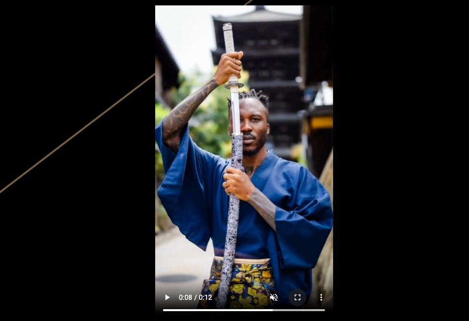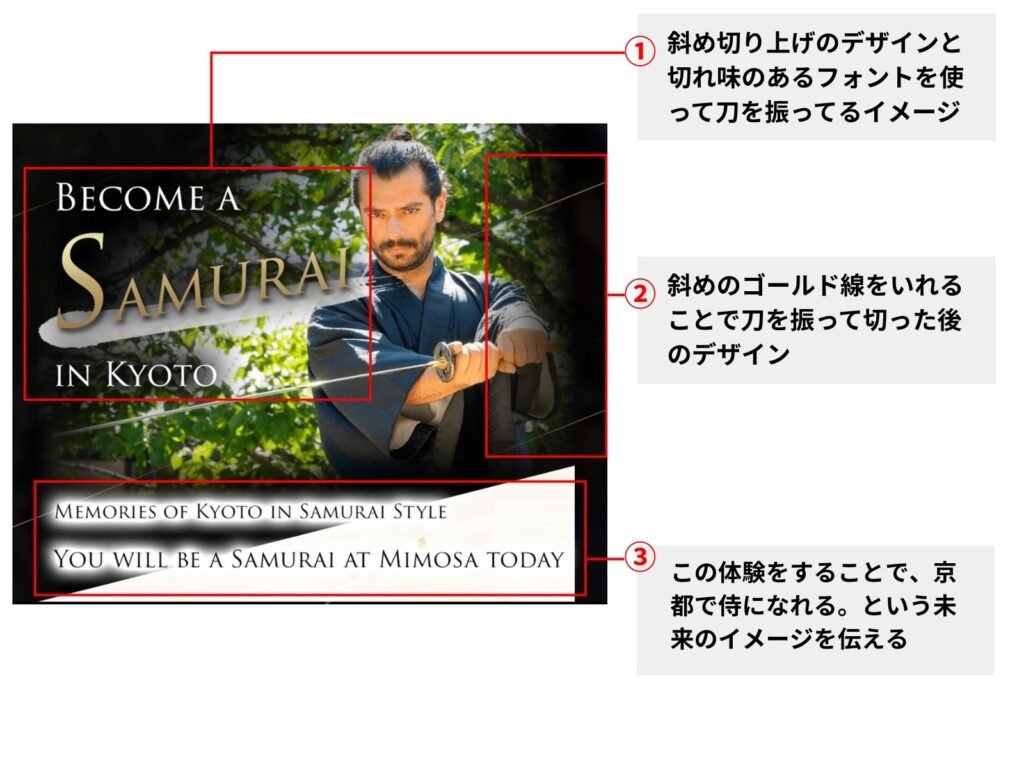 和紙風の背景や斜めのラインを入れることで、日本らしい雰囲気を強調。さらに「刀で振り抜いたようなイメージ」を連想させ、サムライ体験の世界観をデザイン面でも訴求しています。