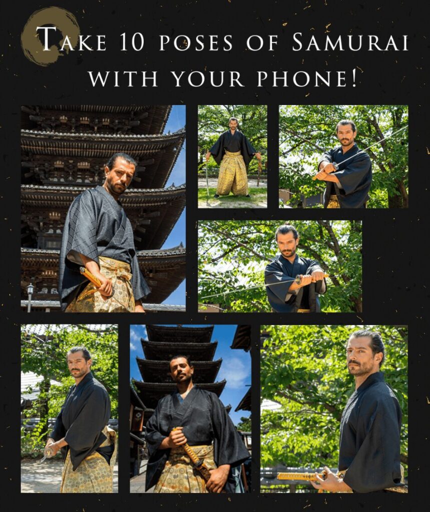 侍体験のクライマックスとして“10ポーズの撮影”を用意。数字でお得感を出しつつ、京都らしい背景と侍姿のビジュアルでSNS映えを狙える設計