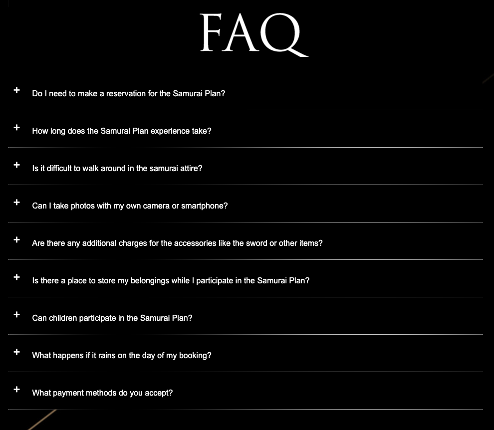 訪日観光客が抱く典型的な不安を先回りして解消するFAQを設計。予約方法・所要時間・雨天対応・支払い方法など細部まで明記することで、安心感を与え申込み率アップを狙いました。