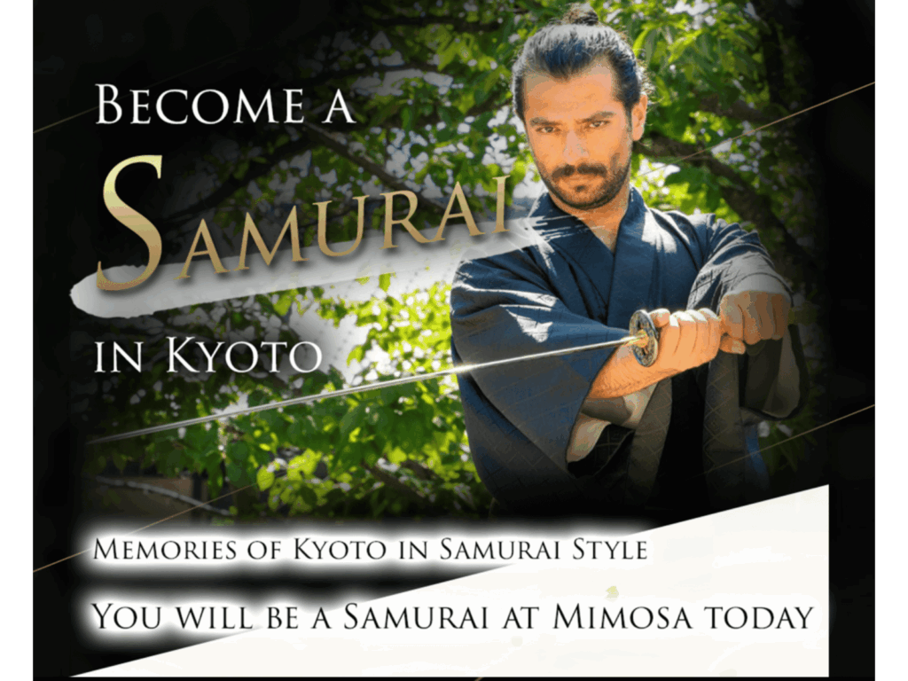 「You will be a Samurai at Mimosa today」というコピーで、この体験を通じて“自分がサムライになる未来”を想像させます。京都という土地柄と相まって、非日常的な没入感を与えます。