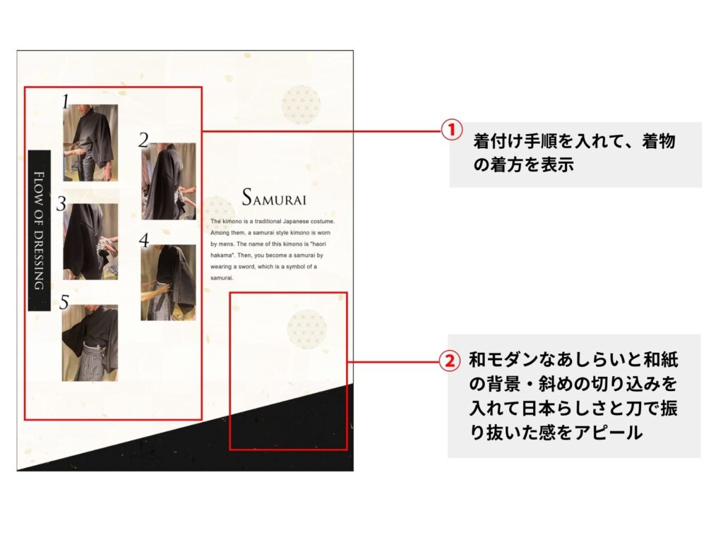 サムライ着付けの手順をステップ形式で掲載し、初めての方でも安心できる構成に。背景には和紙風の質感や斜めの切り込みを入れて、日本らしさとサムライらしい力強さを同時に演出しました。