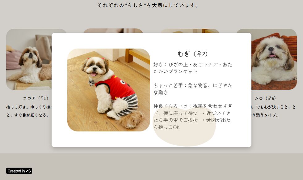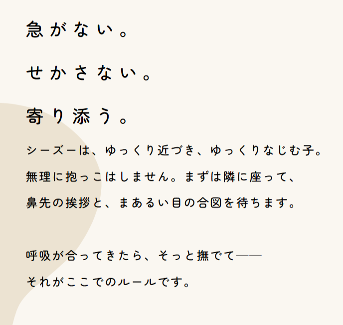このセクションでは、シーズーそれぞれの性格を丁寧に紹介しながら、「仲良くなるコツ」を添えることで、初めて来店される方にも安心感を与えています。
