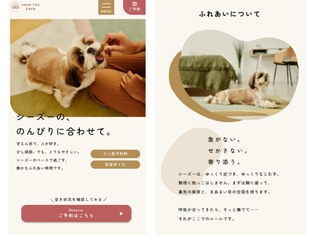 また、淡い色合いと余白を活かしたレイアウトにより、シーズーと過ごす穏やかな時間を想起できるようにしています。