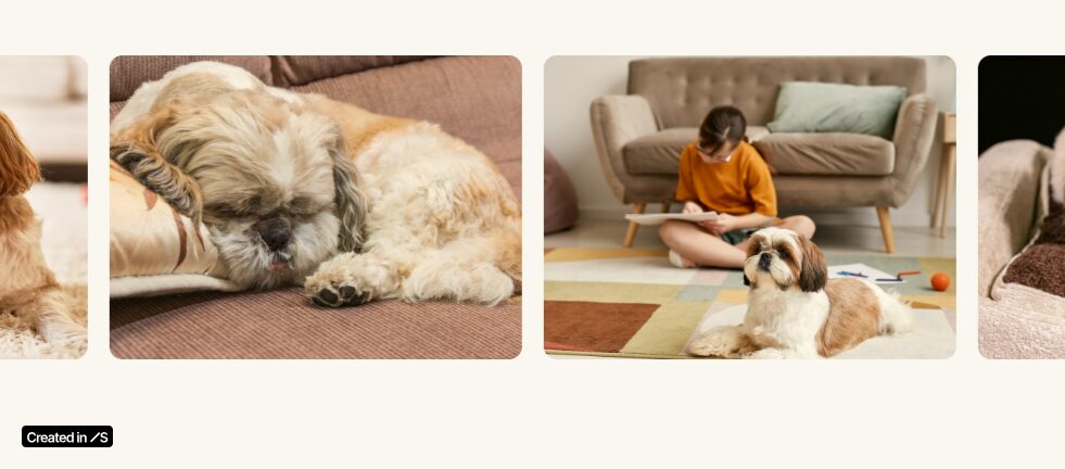 シーズーののんびりした空気感を壊さないよう、切り替えはゆっくりフェードで。角を丸めたフレームとやさしい余白を合わせて、“穏やかな居心地”が伝わるように工夫しています。